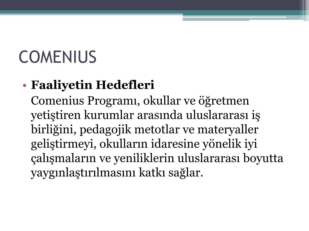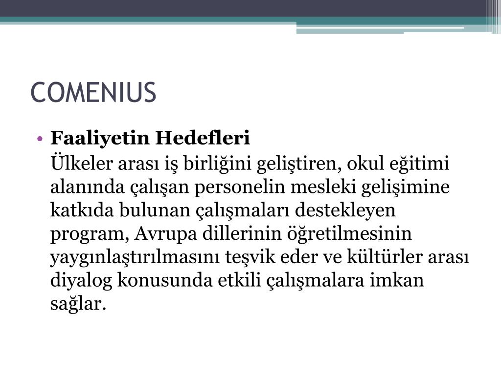 COMENIUS • Faaliyetin Hedefleri Ülkeler arası iş birliğini geliştiren, okul eğitimi alanında çalışan personelin mesleki gelişimine katkıda bulunan çalışmaları destekleyen program, Avrupa dillerinin öğretilmesinin yaygınlaştırılmasını teşvik eder ve kültürler arası diyalog konusunda etkili çalışmalara imkan sağlar.