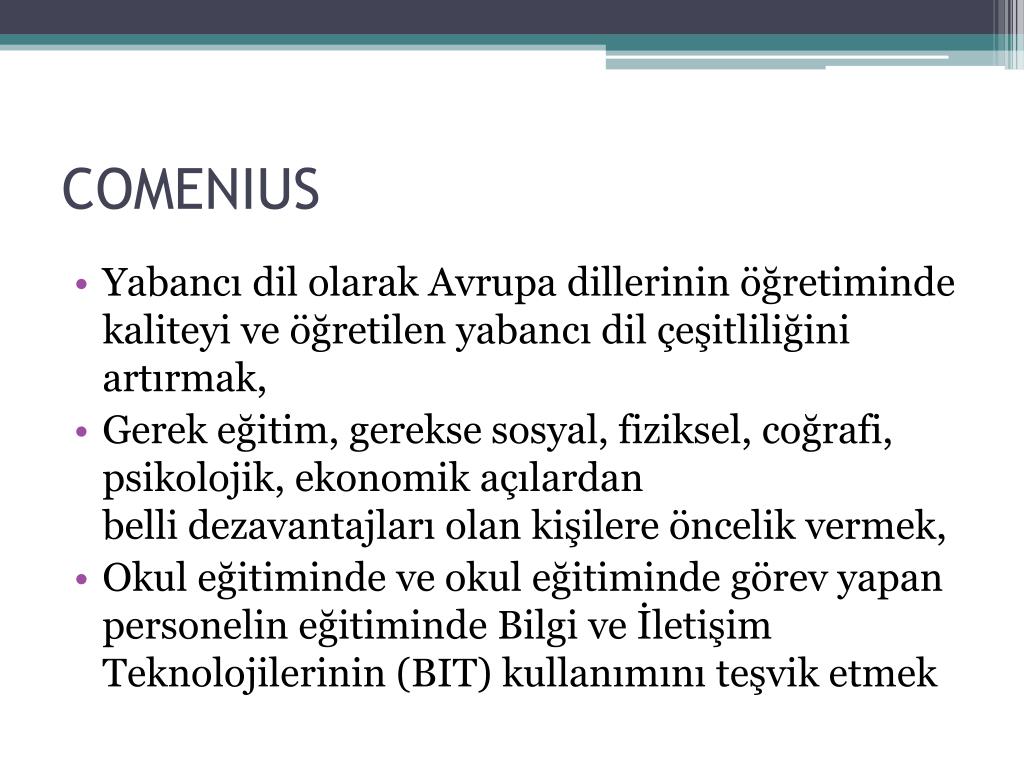 COMENIUS • Yabancı dil olarak Avrupa dillerinin öğretiminde kaliteyi ve öğretilen yabancı dil çeşitliliğini artırmak, • Gerek eğitim, gerekse sosyal, fiziksel, coğrafi, psikolojik, ekonomik açılardan belli dezavantajları olan kişilere öncelik vermek, • Okul eğitiminde ve okul eğitiminde görev yapan personelin eğitiminde Bilgi ve İletişim Teknolojilerinin (BIT) kullanımını teşvik etmek
