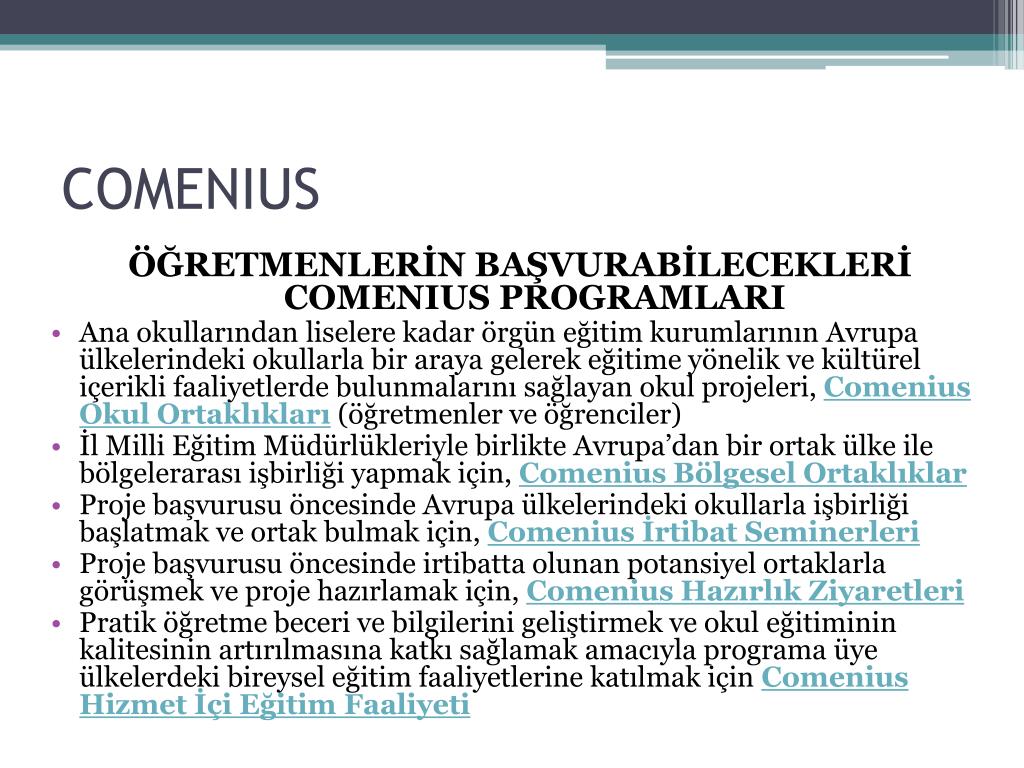 COMENIUS ÖĞRETMENLERİN BAŞVURABİLECEKLERİ COMENIUS PROGRAMLARI • Ana okullarından liselere kadar örgün eğitim kurumlarının Avrupa ülkelerindeki okullarla bir araya gelerek eğitime yönelik ve kültürel içerikli faaliyetlerde bulunmalarını sağlayan okul projeleri, Comenius Okul Ortaklıkları (öğretmenler ve öğrenciler) • İl Milli Eğitim Müdürlükleriyle birlikte Avrupa’dan bir ortak ülke ile bölgelerarası işbirliği yapmak için, Comenius Bölgesel Ortaklıklar • Proje başvurusu öncesinde Avrupa ülkelerindeki okullarla işbirliği başlatmak ve ortak bulmak için, Comenius İrtibat Seminerleri • Proje başvurusu öncesinde irtibatta olunan potansiyel ortaklarla görüşmek ve proje hazırlamak için, Comenius Hazırlık Ziyaretleri • Pratik öğretme beceri ve bilgilerini geliştirmek ve okul eğitiminin kalitesinin artırılmasına katkı sağlamak amacıyla programa üye ülkelerdeki bireysel eğitim faaliyetlerine katılmak için Comenius Hizmet İçi Eğitim Faaliyeti