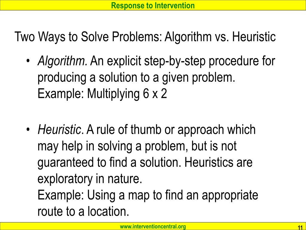 Two Ways to Solve Problems: Algorithm vs. Heuristic • Algorithm. An explicit step-by-step procedure for producing a solution to a given problem. Example: Multiplying 6 x 2 • Heuristic. A rule of thumb or approach which may help in solving a problem, but is not guaranteed to find a solution. Heuristics are exploratory in nature. Example: Using a map to find an appropriate route to a location.