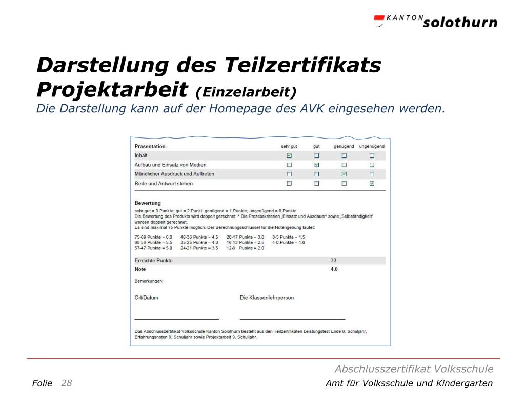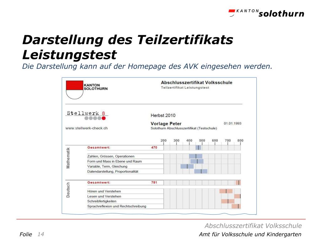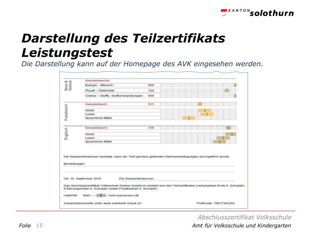 Darstellung des Teilzertifikats Leistungstest Die Darstellung kann auf der Homepage des AVK eingesehen werden. Abschlusszertifikat Volksschule