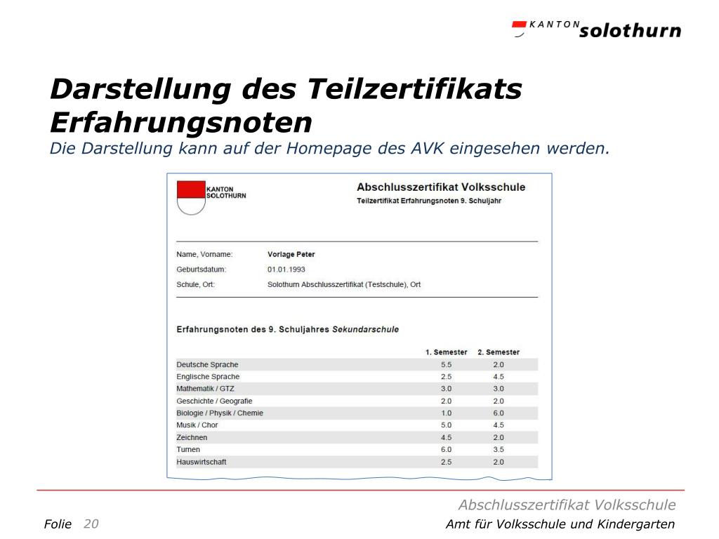 Darstellung des Teilzertifikats ErfahrungsnotenDie Darstellung kann auf der Homepage des AVK eingesehen werden. Abschlusszertifikat Volksschule