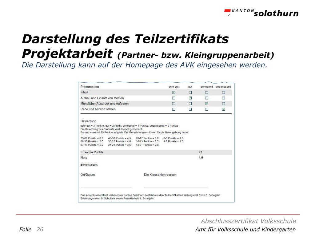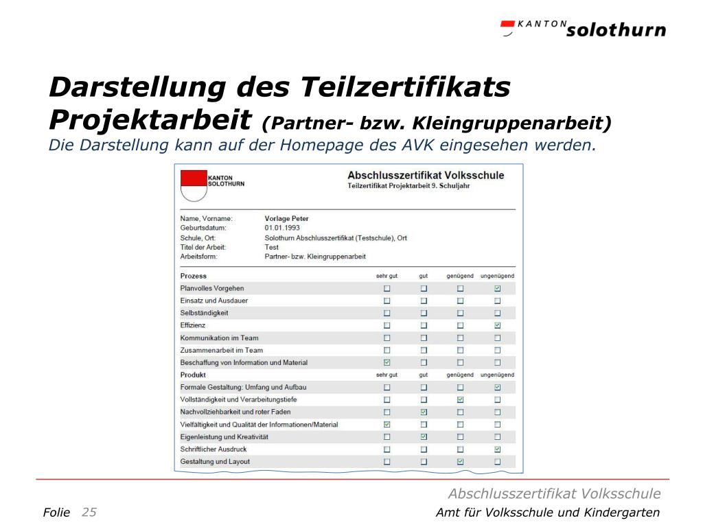 Darstellung des Teilzertifikats Projektarbeit (Einzelarbeit)Die Darstellung kann auf der Homepage des AVK eingesehen werden. Abschlusszertifikat Volksschule
