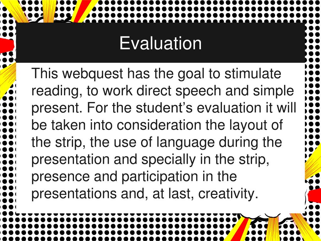 Evaluation Thiswebquesthasthegoal to stimulatereading, to work direct speech andsimplepresent.For thestudent’sevaluation it willbetakenintoconsiderationthe layout ofthestrip, the use oflanguageduringthepresentationandspecially in thestrip, presenceandparticipation in thepresentationsand, atlast, creativity.