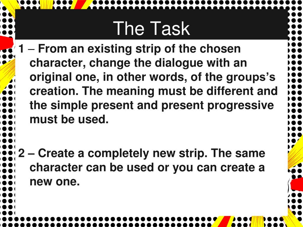 TheTask 1 – Fromanexistingstripofthechosencharacter, changethe dialogue withan original one, in otherwords, ofthegroups’screation. Themeaningmustbedifferentandthesimplepresentandpresentprogressivemustbeused. 2 – Create a completelynewstrip. Thesamecharactercanbeusedoryoucancreate a newone.