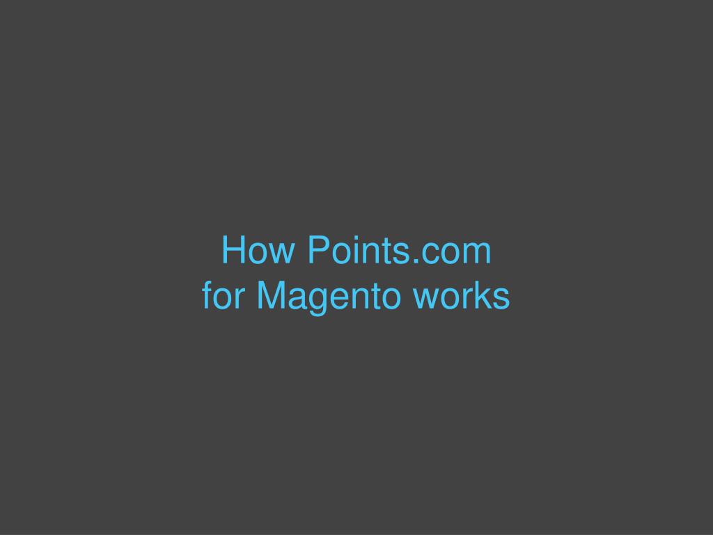 Exceptionally easy to set up, Points.com for Magento is a robust incentive program unlike any other available. Download and install the Points.comfor Magentoextension Purchase generic points and miles that can be distributed by any denomination through award codes