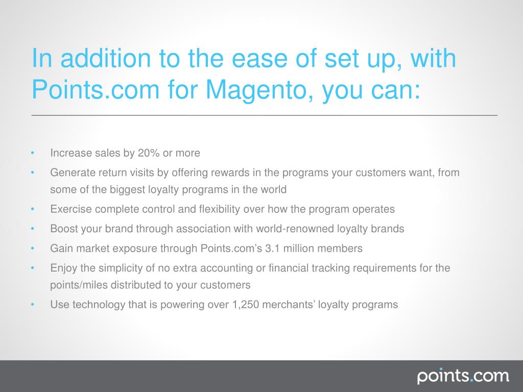 In addition to the ease of set up, with Points.com for Magento, you can: Increase sales by 20% or more Generate return visits by offering rewards in the programs your customers want, from some of the biggest loyalty programs in the world Exercise complete control and flexibility over how the program operates Boost your brand through association with world-renowned loyalty brands Gain market exposure through Points.com’s 3.1 million members Enjoy the simplicity of no extra accounting or financial tracking requirements for the points/miles distributed to your customers Use technology that is powering over 1,250 merchants’ loyalty programs