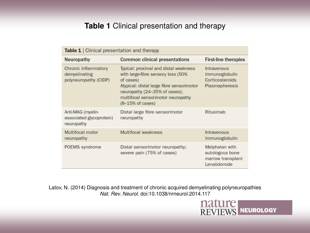 Table 1 Clinical presentation and therapy. Latov, N. (2014) Diagnosis and treatment of chronic acquired demyelinating polyneuropathies Nat. Rev. Neurol. doi:10.1038/nrneurol.2014.117.