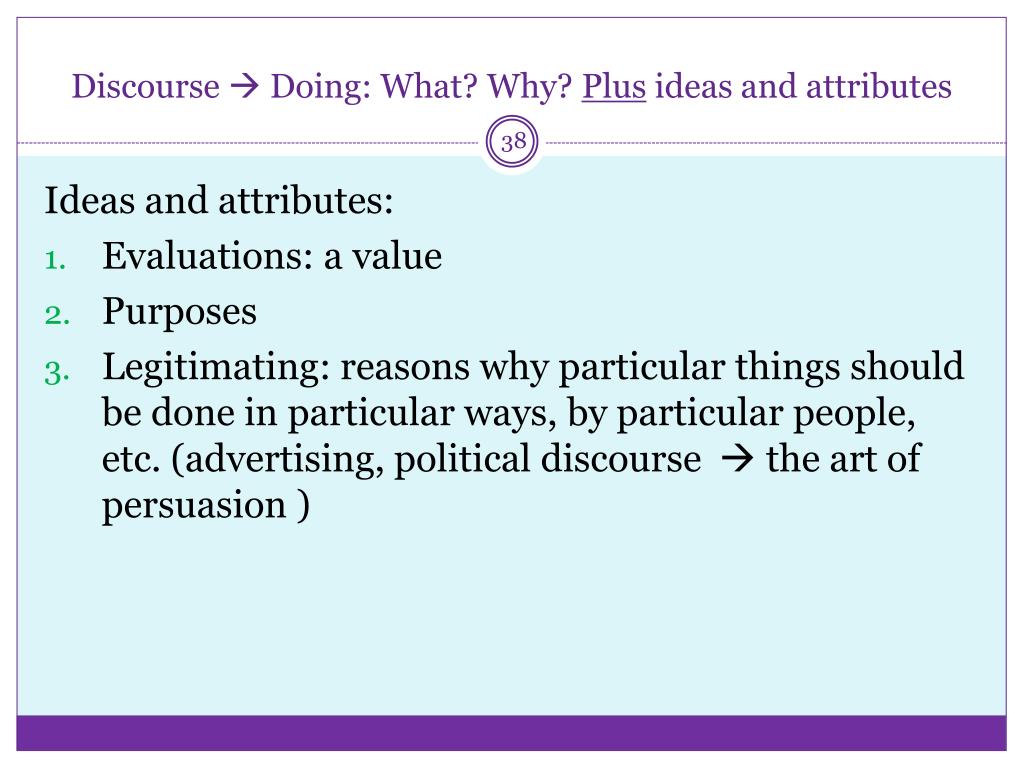Discourse Doing: What? Why? Plus ideas and attributes Ideas and attributes: Evaluations: a value Purposes Legitimating: reasons why particular things should be done in particular ways, by particular people, etc. (advertising, political discourse the art of persuasion )