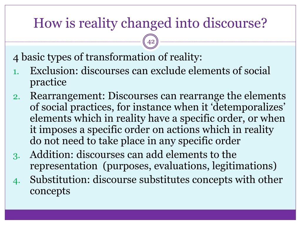 How is reality changed into discourse? 4 basic types of transformation of reality: Exclusion: discourses can exclude elements of social practice Rearrangement: Discourses can rearrange the elements of social practices, for instance when it ‘detemporalizes’ elements which in reality have a specific order, or when it imposes a specific order on actions which in reality do not need to take place in any specific order Addition: discourses can add elements to the representation (purposes, evaluations, legitimations) Substitution: discourse substitutes concepts with other concepts