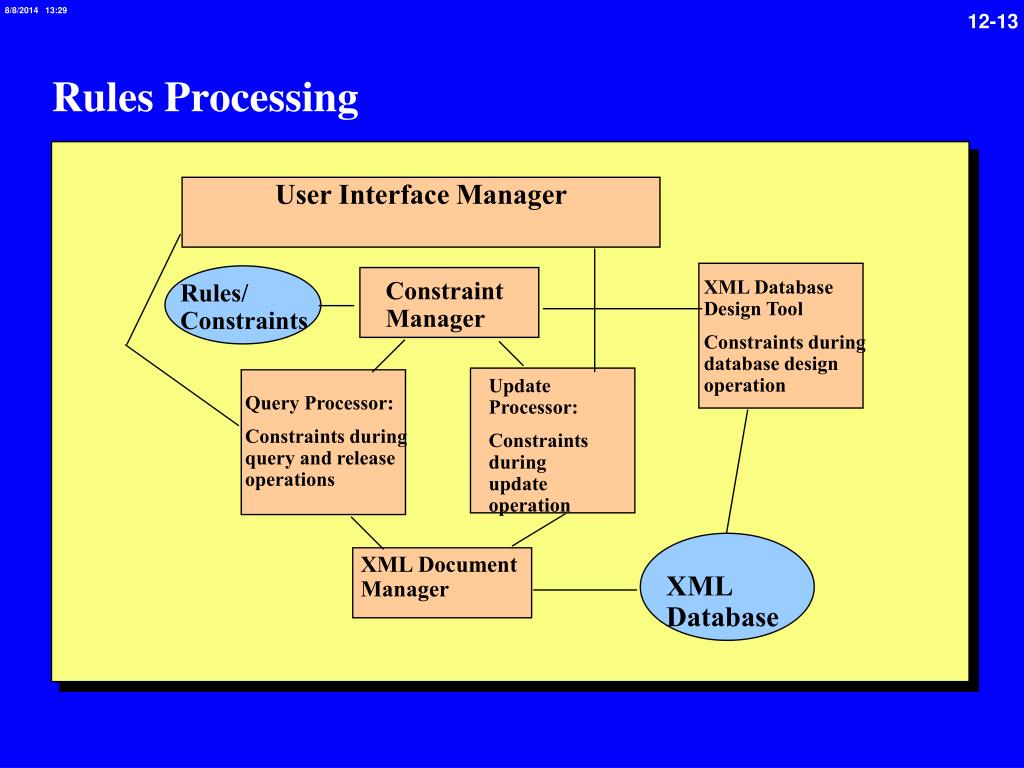 Rules Processing User Interface Manager XML Database Design Tool Constraints during database design operation Constraint Manager Rules/ Constraints Update Processor: Constraints during update operation Query Processor: Constraints during query and release operations XML Document Manager XML Database