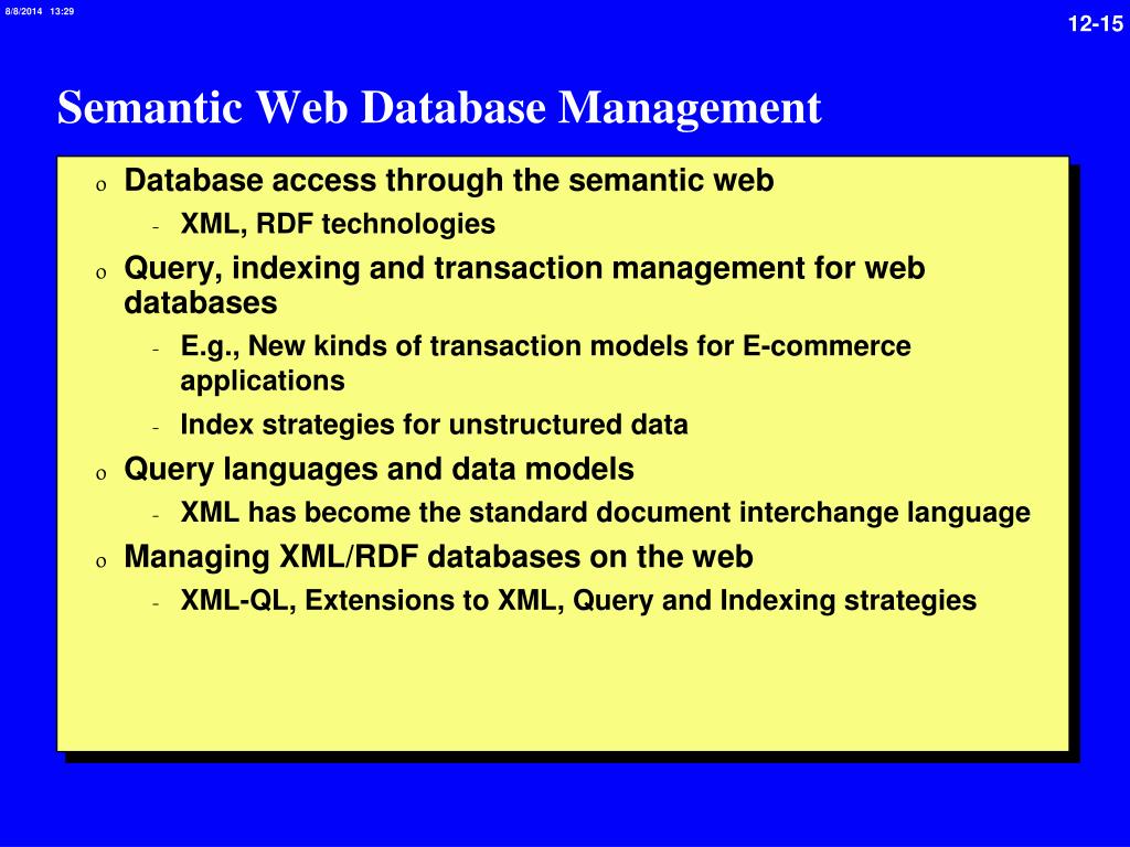 Semantic Web Database Management • Database access through the semantic web • XML, RDF technologies • Query, indexing and transaction management for web databases • E.g., New kinds of transaction models for E-commerce applications • Index strategies for unstructured data • Query languages and data models • XML has become the standard document interchange language • Managing XML/RDF databases on the web • XML-QL, Extensions to XML, Query and Indexing strategies