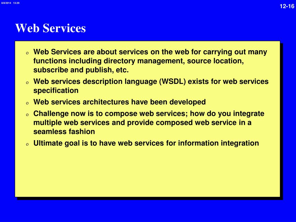 Web Services • Web Services are about services on the web for carrying out many functions including directory management, source location, subscribe and publish, etc. • Web services description language (WSDL) exists for web services specification • Web services architectures have been developed • Challenge now is to compose web services; how do you integrate multiple web services and provide composed web service in a seamless fashion • Ultimate goal is to have web services for information integration