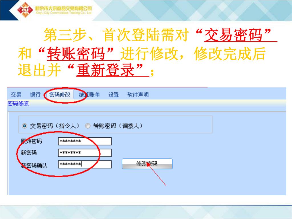 第三步、首次登陆需对“交易密码”和“转账密码”进行修改,修改完成后退出并“重新登录”;第三步、首次登陆需对“交易密码”和“转账密码”进行修改,修改完成后退出并“重新登录”;