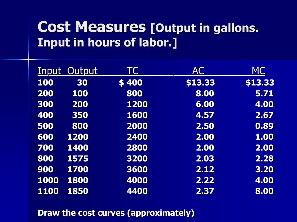 Cost Measures [Output in gallons. Input in hours of labor.] Input Output TC __ AC MC 100 30 $ 400 $13.33 $13.33 200 100 800 8.00 5.71 300 200 1200 6.00 4.00 400 350 1600 4.57 2.67 500 800 2000 2.50 0.89 600 1200 2400 2.00 1.00 700 1400 2800 2.00 2.00 800 1575 3200 2.03 2.28 900 1700 3600 2.12 3.20 1000 1800 4000 2.22 4.00 11001850 4400 2.37 8.00 Draw the cost curves (approximately)