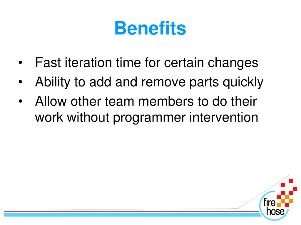 Benefits • Fast iteration time for certain changes • Ability to add and remove parts quickly • Allow other team members to do their work without programmer intervention