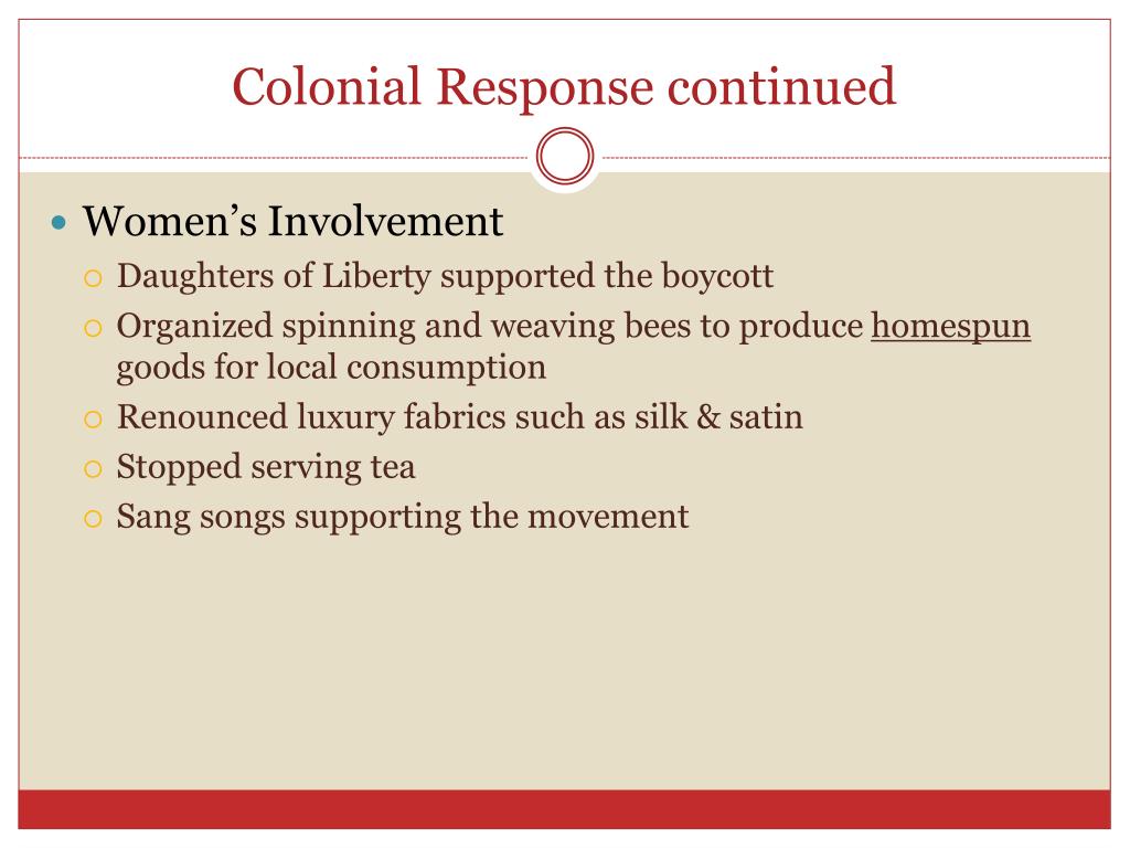 Colonial Response continued • Women’s Involvement • Daughters of Liberty supported the boycott • Organized spinning and weaving bees to produce homespun goods for local consumption • Renounced luxury fabrics such as silk & satin • Stopped serving tea • Sang songs supporting the movement