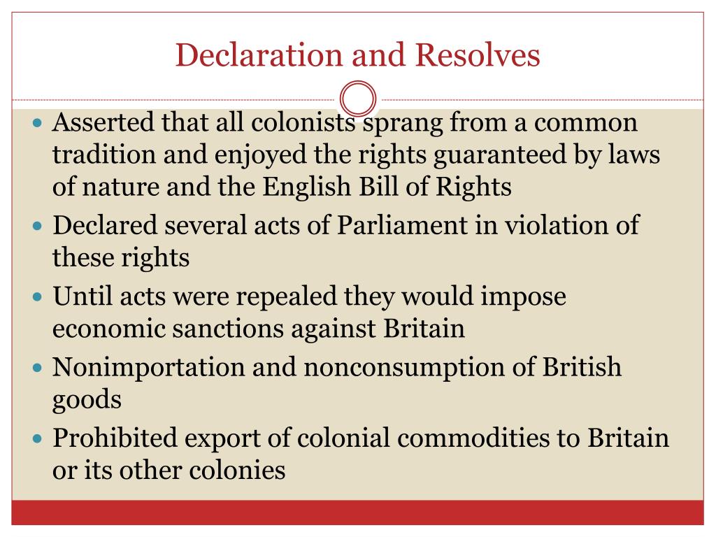 Declaration and Resolves Asserted that all colonists sprang from a common tradition and enjoyed the rights guaranteed by laws of nature and the English Bill of Rights Declared several acts of Parliament in violation of these rights Until acts were repealed they would impose economic sanctions against Britain Nonimportation and nonconsumption of British goods Prohibited export of colonial commodities to Britain or its other colonies