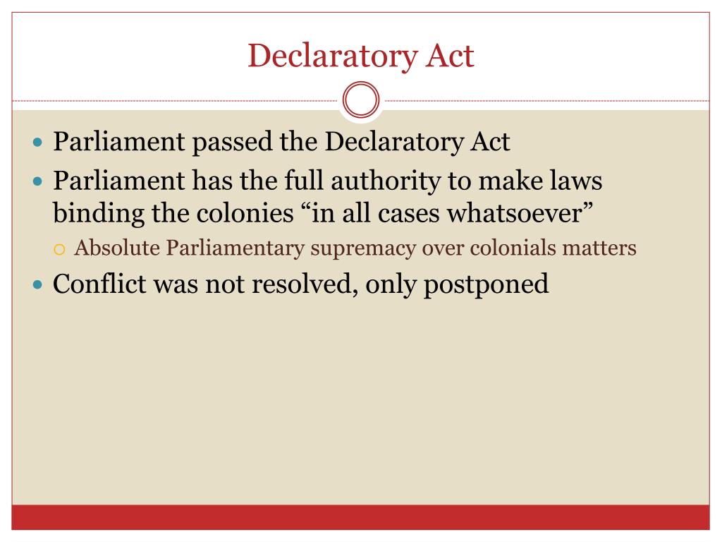 Declaratory Act • Parliament passed the Declaratory Act • Parliament has the full authority to make laws binding the colonies “in all cases whatsoever” • Absolute Parliamentary supremacy over colonials matters • Conflict was not resolved, only postponed