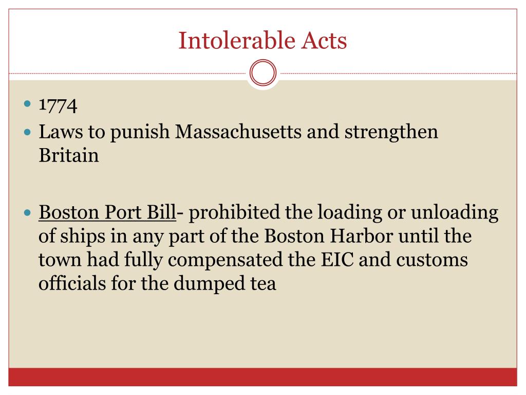 Intolerable Acts 1774 Laws to punish Massachusetts and strengthen Britain Boston Port Bill- prohibited the loading or unloading of ships in any part of the Boston Harbor until the town had fully compensated the EIC and customs officials for the dumped tea