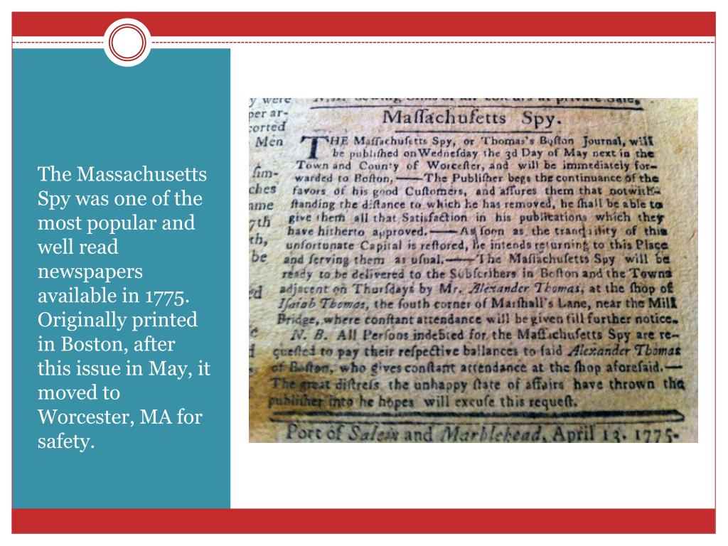 The Massachusetts Spy was one of the most popular and well read newspapers available in 1775. Originally printed in Boston, after this issue in May, it moved to Worcester, MA for safety.