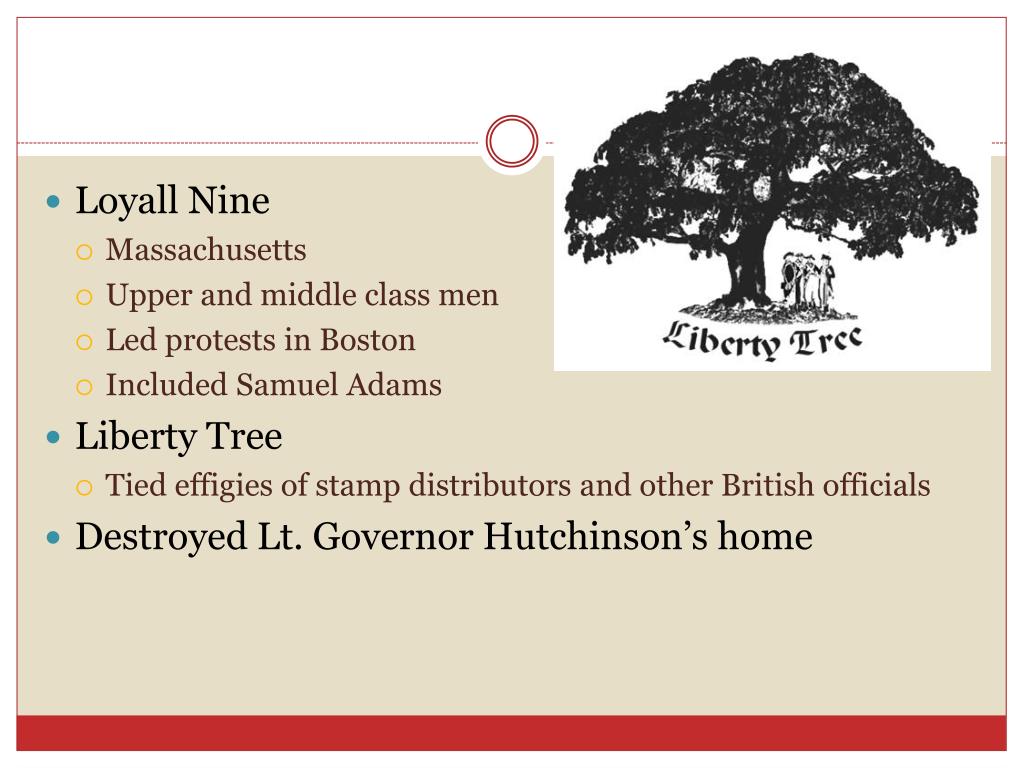 Loyall Nine • Massachusetts • Upper and middle class men • Led protests in Boston • Included Samuel Adams • Liberty Tree • Tied effigies of stamp distributors and other British officials • Destroyed Lt. Governor Hutchinson’s home