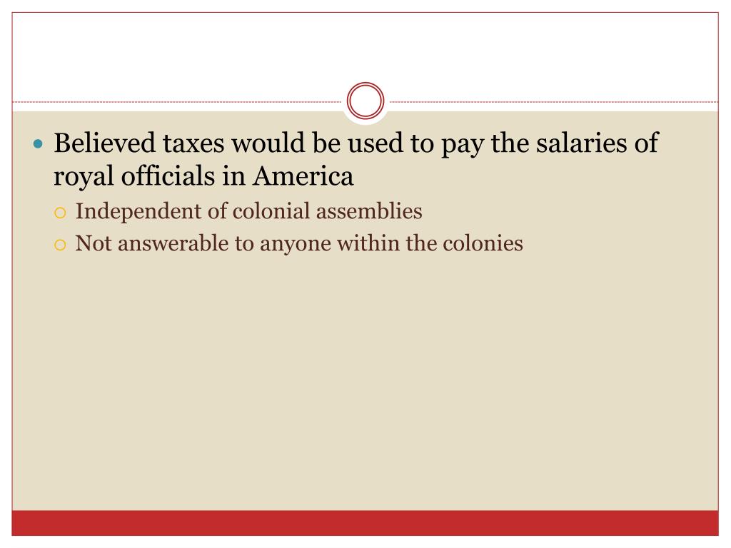 Believed taxes would be used to pay the salaries of royal officials in America • Independent of colonial assemblies • Not answerable to anyone within the colonies