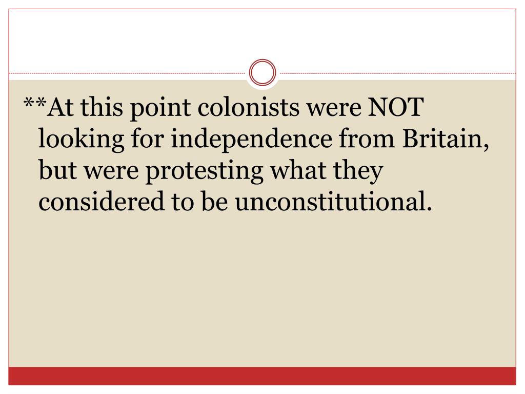 **At this point colonists were NOT looking for independence from Britain, but were protesting what they considered to be unconstitutional.