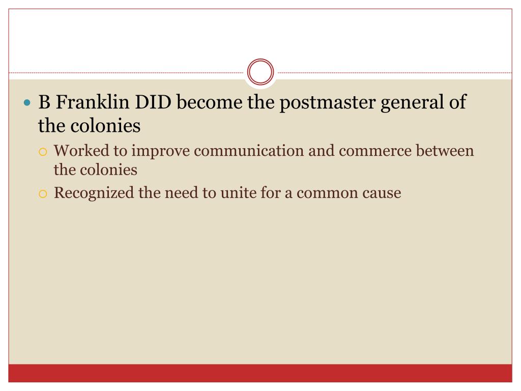 B Franklin DID become the postmaster general of the colonies • Worked to improve communication and commerce between the colonies • Recognized the need to unite for a common cause