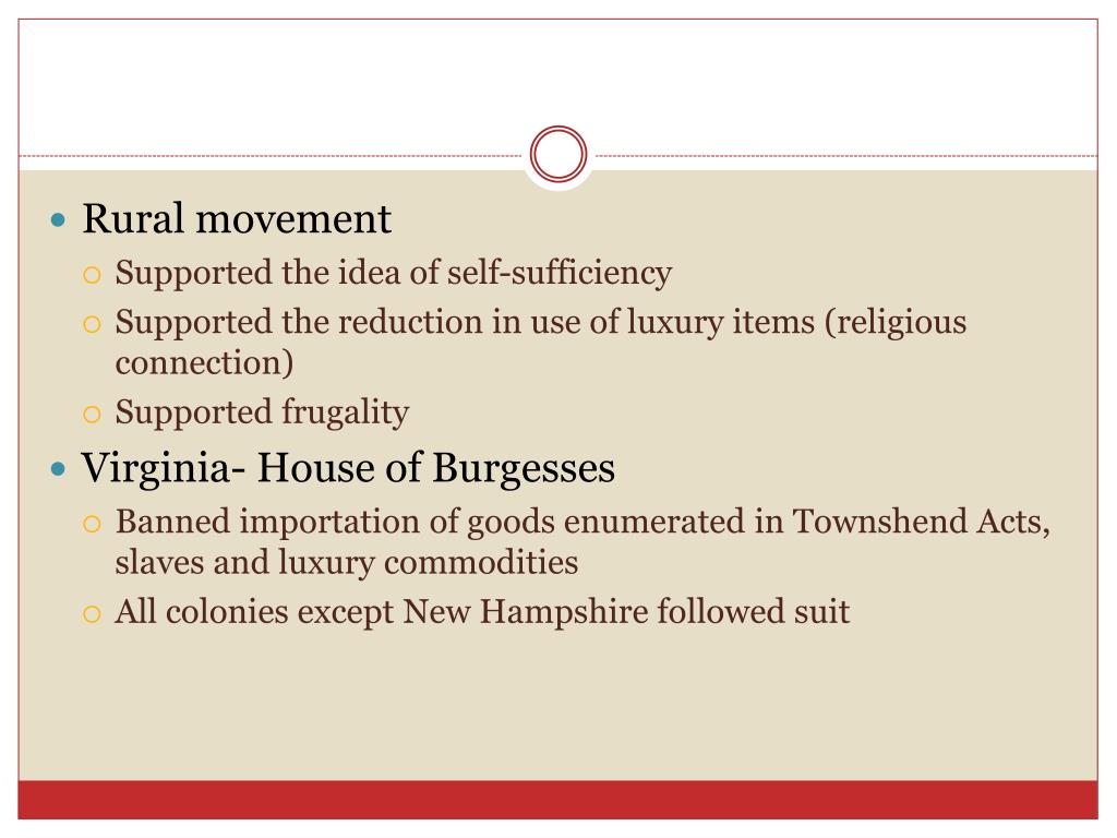 Rural movement • Supported the idea of self-sufficiency • Supported the reduction in use of luxury items (religious connection) • Supported frugality • Virginia- House of Burgesses • Banned importation of goods enumerated in Townshend Acts, slaves and luxury commodities • All colonies except New Hampshire followed suit