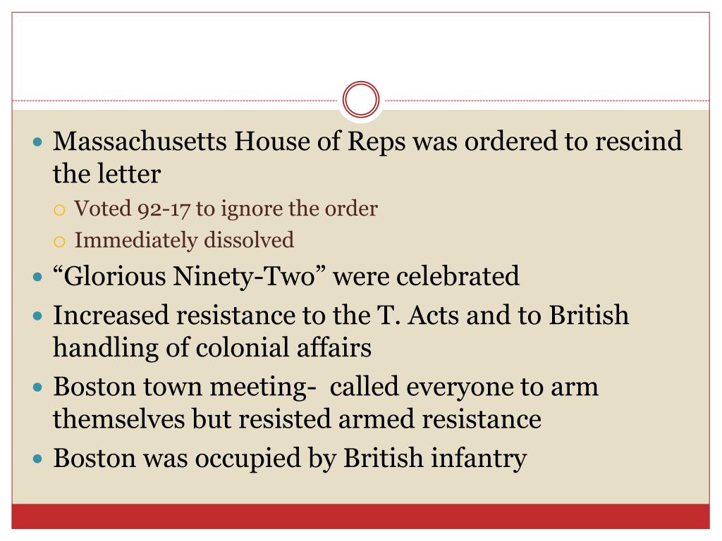 Massachusetts House of Reps was ordered to rescind the letter • Voted 92-17 to ignore the order • Immediately dissolved • “Glorious Ninety-Two” were celebrated • Increased resistance to the T. Acts and to British handling of colonial affairs • Boston town meeting- called everyone to arm themselves but resisted armed resistance • Boston was occupied by British infantry