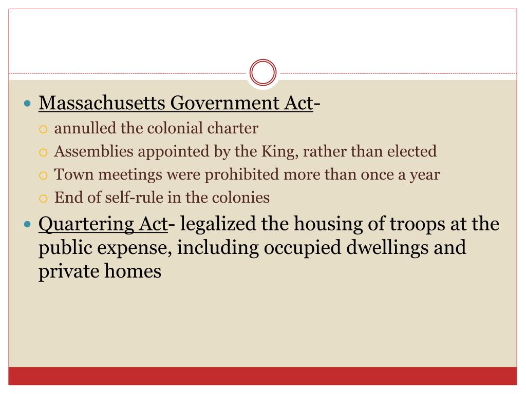 Massachusetts Government Act- • annulled the colonial charter • Assemblies appointed by the King, rather than elected • Town meetings were prohibited more than once a year • End of self-rule in the colonies • Quartering Act- legalized the housing of troops at the public expense, including occupied dwellings and private homes