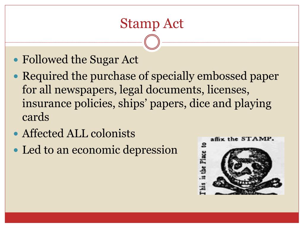 Stamp Act Followed the Sugar Act Required the purchase of specially embossed paper for all newspapers, legal documents, licenses, insurance policies, ships’ papers, dice and playing cards Affected ALL colonists Led to an economic depression