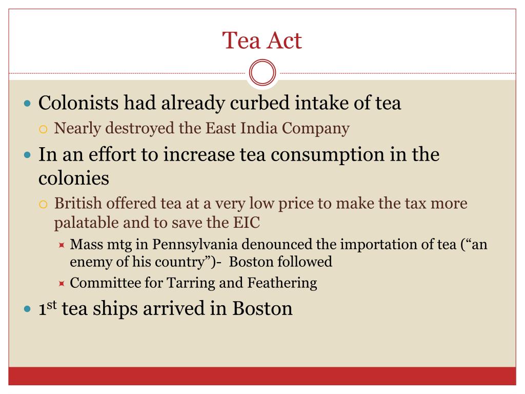Tea Act • Colonists had already curbed intake of tea • Nearly destroyed the East India Company • In an effort to increase tea consumption in the colonies • British offered tea at a very low price to make the tax more palatable and to save the EIC • Mass mtg in Pennsylvania denounced the importation of tea (“an enemy of his country”)- Boston followed • Committee for Tarring and Feathering • 1st tea ships arrived in Boston