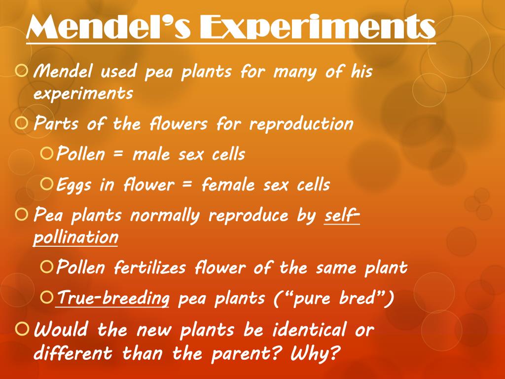 Mendel’s Experiments • Mendel used pea plants for many of his experiments • Parts of the flowers for reproduction • Pollen = male sex cells • Eggs in flower = female sex cells • Pea plants normally reproduce by self-pollination • Pollen fertilizes flower of the same plant • True-breeding pea plants (“pure bred”) • Would the new plants be identical or different than the parent? Why?