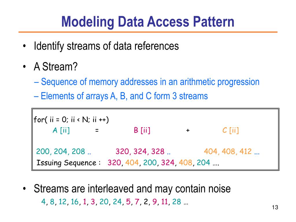 Modeling Data Access Pattern • Identify streams of data references • A Stream? • – Sequence of memory addresses in an arithmetic progression • – Elements of arrays A, B, and C form 3 streams • for( ii = 0; ii < N; ii ++) • A [ii]= B [ii] +C [ii] • 200, 204, 208 .. 320, 324, 328 .. 404, 408, 412 ... • Issuing Sequence :320,404,200,324,408,204…. • Streams are interleaved and may contain noise • 4, 8, 12, 16, 1, 3, 20, 24, 5, 7, 2, 9, 11, 28 …