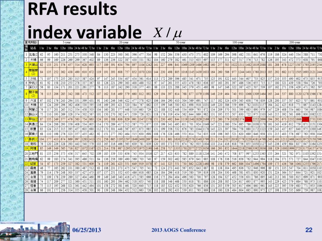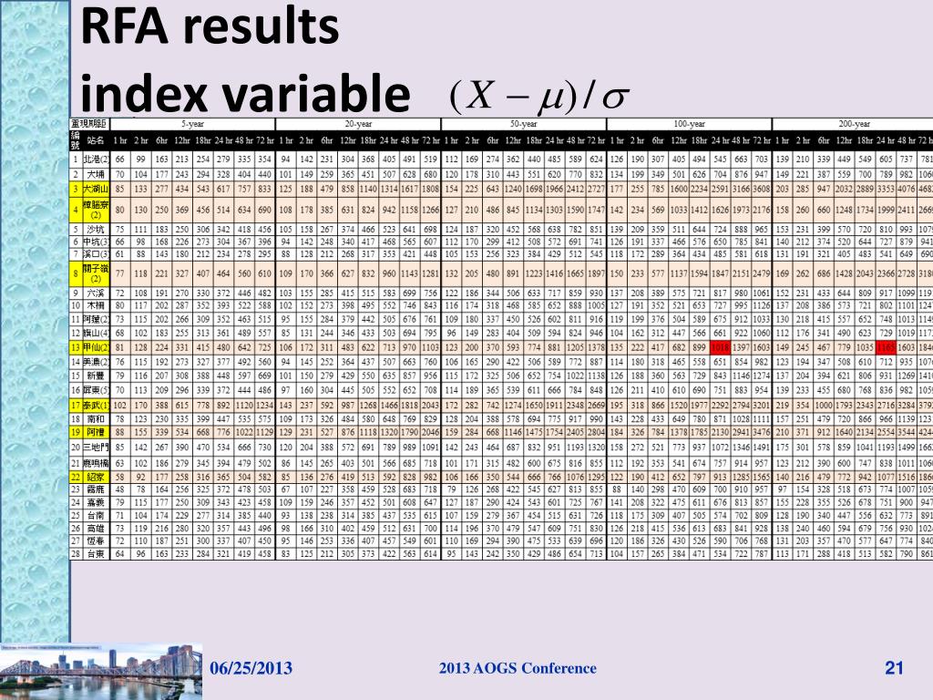 Extraordinary rainfalls are extreme outliers. • Whether outliers should be included/excluded in frequency is arguable. • Random characteristics of extraordinary rainfalls • Occurrences of extraordinary rainfalls are very rare. • Within a not-too-long period, the probability of having repeated occurrences of extraordinary rainfalls at one station is very low. However, extraordinary rainfalls can occur at different locations. • Regional frequency analysis (RFA) is adopted to deal with presence of extraordinary rainfalls in frequency analysis. 2013 AOGS Conference