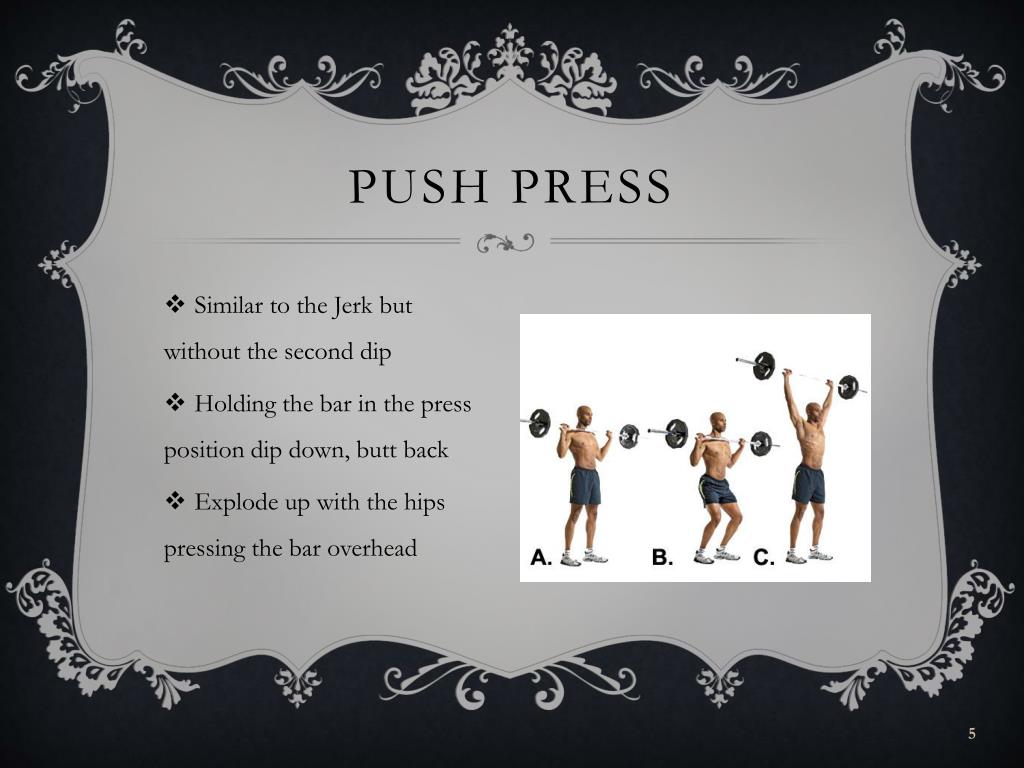 Push Press • Similar to the Jerk but without the second dip • Holding the bar in the press position dip down, butt back • Explode up with the hips pressing the bar overhead