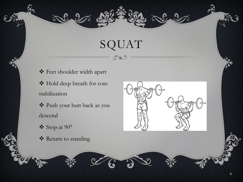 Squat • Feet shoulder width apart • Hold deep breath for core stabilization • Push your butt back as you descend • Stop at 90° • Return to standing
