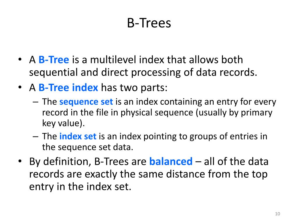 B-Trees • A B-Tree is a multilevel index that allows both sequential and direct processing of data records. • A B-Tree index has two parts: • The sequence set is an index containing an entry for every record in the file in physical sequence (usually by primary key value). • The index set is an index pointing to groups of entries in the sequence set data. • By definition, B-Trees are balanced – all of the data records are exactly the same distance from the top entry in the index set.