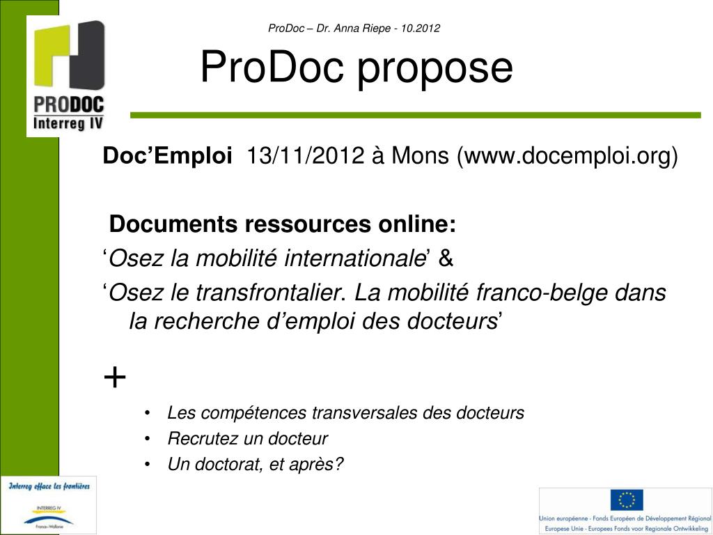 ProDoc propose • Doc’Emploi 13/11/2012 à Mons (www.docemploi.org) • Documents ressources online: • ‘Osez la mobilité internationale’ & • ‘Osez le transfrontalier. La mobilité franco-belge dans la recherche d’emploi des docteurs’ • + • Les compétences transversales des docteurs • Recrutez un docteur • Un doctorat, et après?