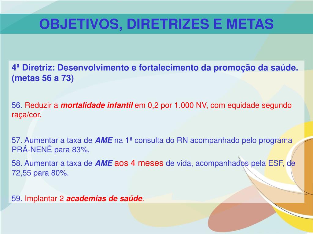 OBJETIVOS, DIRETRIZES E METAS 4ª Diretriz: Desenvolvimento e fortalecimento da promoção da saúde.(metas 56 a 73) 56. Reduzir a mortalidade infantil em 0,2 por 1.000 NV, com equidade segundo raça/cor. 57. Aumentar a taxa de AME na 1ª consulta do RN acompanhado pelo programa PRÁ-NENÊ para 83%. 58. Aumentar a taxa de AME aos 4 meses de vida, acompanhados pela ESF, de 72,55 para 80%. 59. Implantar 2 academias de saúde.