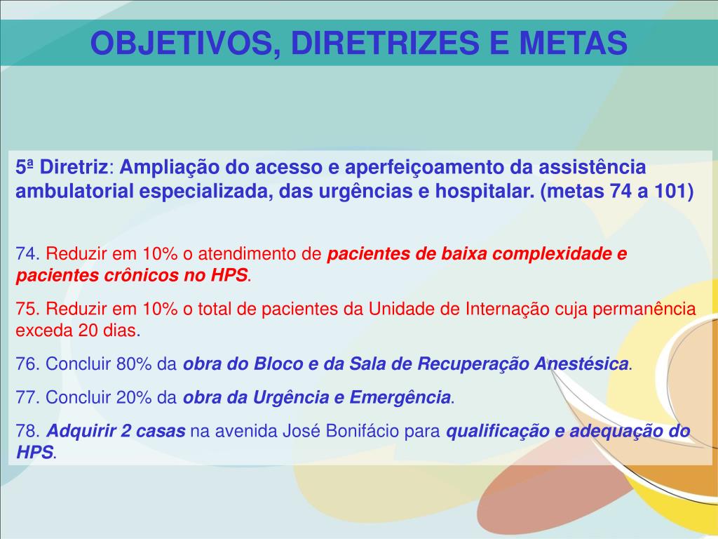 OBJETIVOS, DIRETRIZES E METAS 5ª Diretriz: Ampliação do acesso e aperfeiçoamento da assistência ambulatorial especializada, das urgências e hospitalar. (metas 74 a 101) 74. Reduzir em 10% o atendimento de pacientes de baixa complexidade e pacientes crônicos no HPS. 75. Reduzir em 10% o total de pacientes da Unidade de Internação cuja permanência exceda 20 dias. 76. Concluir 80% da obra do Bloco e da Sala de Recuperação Anestésica. 77. Concluir 20% da obra da Urgência e Emergência. 78. Adquirir 2 casas na avenida José Bonifácio para qualificação e adequação do HPS.