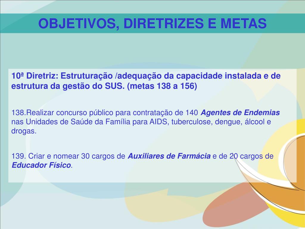 OBJETIVOS, DIRETRIZES E METAS 10ª Diretriz: Estruturação /adequação da capacidade instalada e de estrutura da gestão do SUS. (metas 138 a 156) 138.Realizar concurso público para contratação de 140 Agentes de Endemias nas Unidades de Saúde da Família para AIDS, tuberculose, dengue, álcool e drogas. 139. Criar e nomear 30 cargos de Auxiliares de Farmácia e de 20 cargos de Educador Físico.