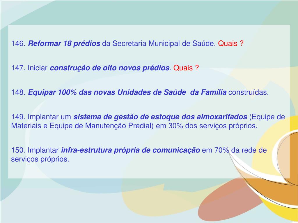 146. Reformar 18 prédios da Secretaria Municipal de Saúde. Quais ? 147. Iniciar construção de oito novos prédios. Quais ? 148. Equipar 100% das novas Unidades de Saúde da Família construídas. 149. Implantar um sistema de gestão de estoque dos almoxarifados (Equipe de Materiais e Equipe de Manutenção Predial) em 30% dos serviços próprios. 150. Implantar infra-estrutura própria de comunicação em 70% da rede de serviços próprios.