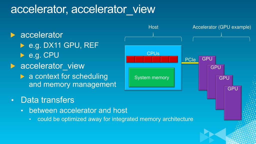 accelerator, accelerator_view • accelerator • e.g. DX11 GPU, REF • e.g. CPU • accelerator_view • a context for scheduling and memory management Host Accelerator (GPU example) CPUs GPU PCIe GPU System memory GPU GPU • Data transfers • between accelerator and host • could be optimized away for integrated memory architecture