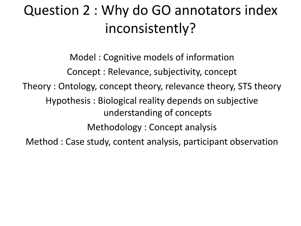 Question 2 : Why do GO annotators index inconsistently? Model : Cognitive models of information Concept : Relevance, subjectivity, concept Theory : Ontology, concept theory, relevance theory, STS theory Hypothesis : Biological reality depends on subjective understanding of concepts Methodology : Concept analysis Method : Case study, content analysis, participant observation