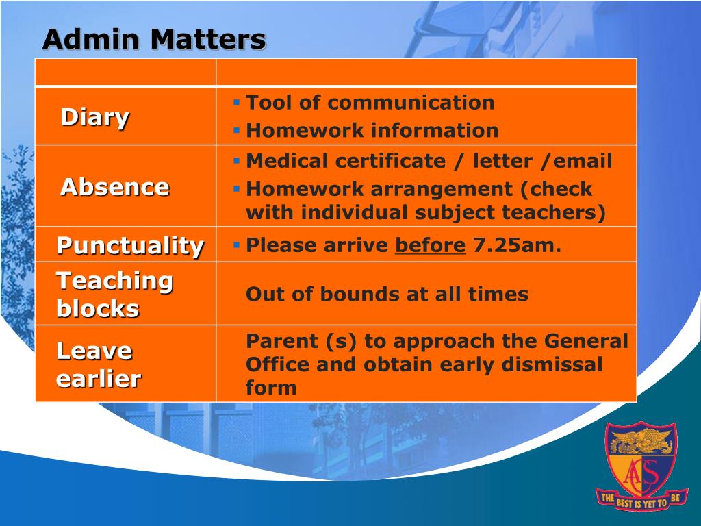 HomeworkPolicy Parents’ particulars are to be updated in the school diary Pupils will record homework in the diary Parents to check school diary daily Pupils are to hand in homework punctually Parents are to sign promptly when there is a parent’s signature stamp on the book / worksheets Files and books will be returned before examination period