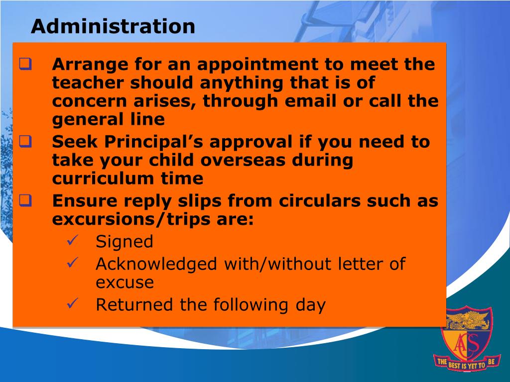 Administration Arrange for an appointment to meet the teacher should anything that is of concern arises, through email or call the general line Seek Principal’s approval if you need to take your child overseas during curriculum time Ensure reply slips from circulars such as excursions/trips are: Signed Acknowledged with/without letter of excuse Returned the following day