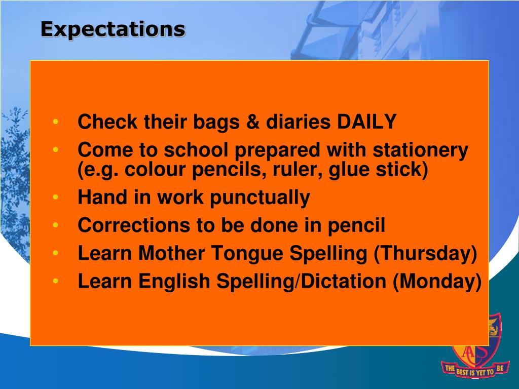 Expectations Check their bags & diaries DAILY Come to school prepared with stationery(e.g. colour pencils, ruler, glue stick) Hand in work punctually Corrections to be done in pencil Learn Mother Tongue Spelling (Thursday) Learn English Spelling/Dictation (Monday)